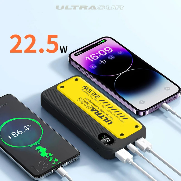 پاوربانک فست شارژ اولتراسور مدل +U-P4 با ظرفیت ۲۰۰۰۰ میلیآمپرساعت، یک همراه قدرتمند برای کسانی است که به شارژ سریع و مطمئن نیاز دارند. این پاوربانک مجهز به سه پورت خروجی شامل دو پورت USB با فناوری QC3.0 و یک پورت PD با توان ۲۲.۵ وات است که میتواند دستگاههای مختلف مانند گوشی، تبلت یا هدفون را با بالاترین سرعت شارژ کند. وجود نمایشگر دیجیتال روی بدنه دستگاه نیز به شما امکان میدهد میزان شارژ باقیمانده را بهصورت دقیق مشاهده کنید.