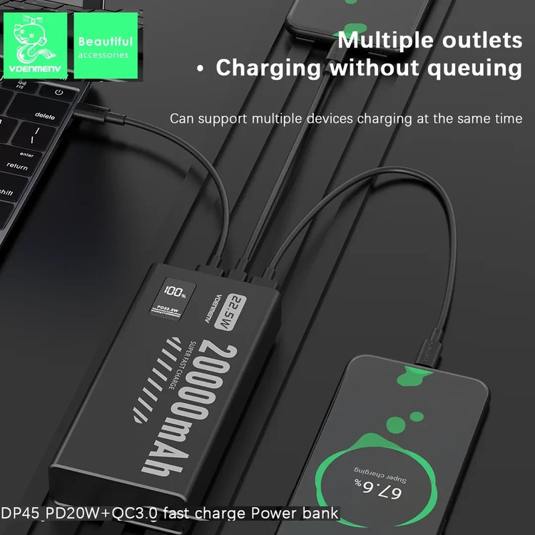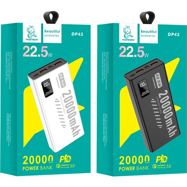 پاوربانک اورجینال V DENMEN V DP45 تولید شرکت وی دنمن از یک باتری لیتیومی با ظرفیت 20000 میلی آمپر ساعت بهره میبرد. با داشتن این پاوربانک دیگر بابت تمام شدن شارژ باتری گوشی موبایل، تبلت دوربین دیجیتال و لوازمی از این قبیل نگرانی نخواهید داشت؛ زیرا میتوانید در هر شرایطی بدون نیاز به پریز برق باتری گوشی موبایل یا دیگر لوازم سازگار با این محصول را تنها با استفاده از یک کابل USB شارژ کنید. در ساخت این دستگاه از تکنولوژی شارژ سریع Quick 3.0 Charge استفاده شده است. پشتیبانی از شارژ سریع به این معنی است که باتری دستگاه شما با کمک این پاوربانک سریعتر از شارژرهای معمولی شارژ خواهد شد. البته باید توجه داشته باشید که تکنولوژی شارژ سریع تنها با دستگاههای دارای استاندارد شارژ سریع و در دستگاههای معمولی امکان استفاده از این تکنولوژی وجود ندارد. با استفاده از نمایشگر LED تعبیه شده در این پاوربانک، شما میتوانید وضعیت شارژ باتری از طریق نمایشگر LED روی بدنه بررسی کنید. بدنه ی این پاوربانک از جنس پلاستیک است. توان کلی این دستگاه تا 22.5 وات میباشد و این دستگاه مجهز به فناوری PD نیز میباشد که قابلیت مناسبی برای کاربران گوشی های نسل جدید و آیفون میباشد.